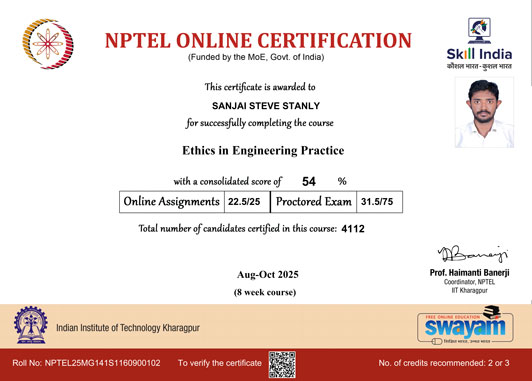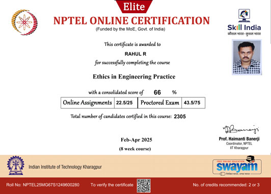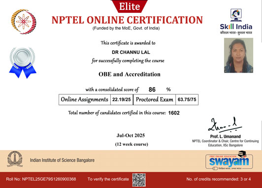 | 5 | Dr. Channulal | NPTEL Online Certification | OBE & Accreditation (Elite Silver ) | Jul-Oct 2025 | View |