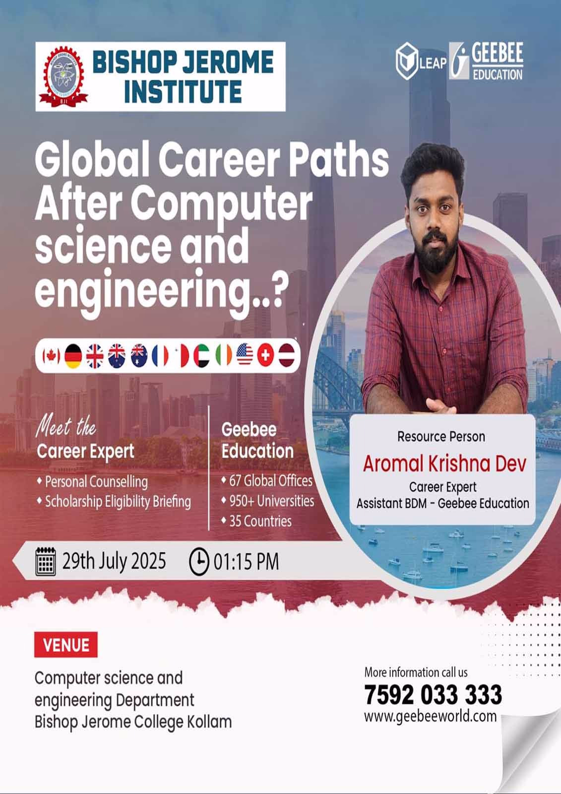 A Career expert talk session on " Global Career Paths After Computer Science and Engineering...?" was successfully conducted on July 29,2025 to explore the diverse job opportunities. The event, organized by the Department of Computer Science and Engineering in collaboration with Geebee Education, aimed to guide students in exploring the wide range of career possibilities after completing B.Tech in Computer Science and Engineering, both in India and abroad. Participants gained a better understanding of how strategic career planning and informed decision-making can lead to successful professional outcomes.
