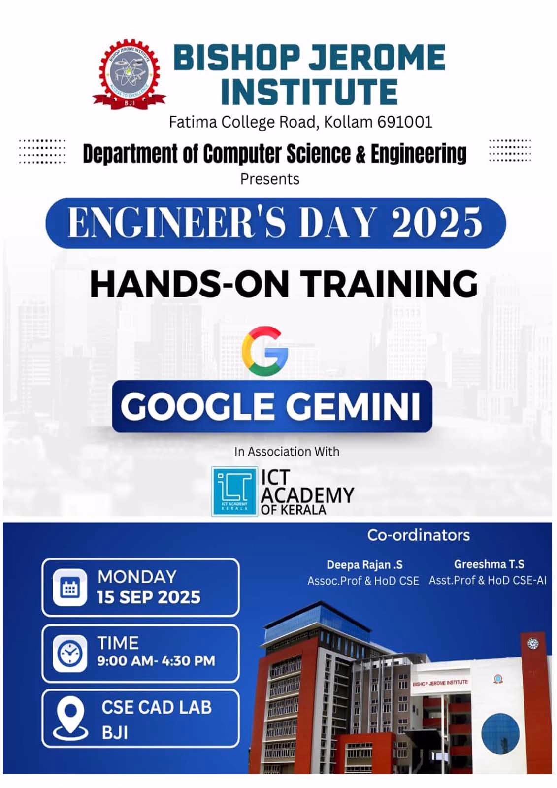 Department of Computer Science & Engineering presents Engineer's Day 2025 hads-on Training on GOOGLE GEMINI in association with ICT ACADEMY OF Kerala ( 15th Sep 2025.)