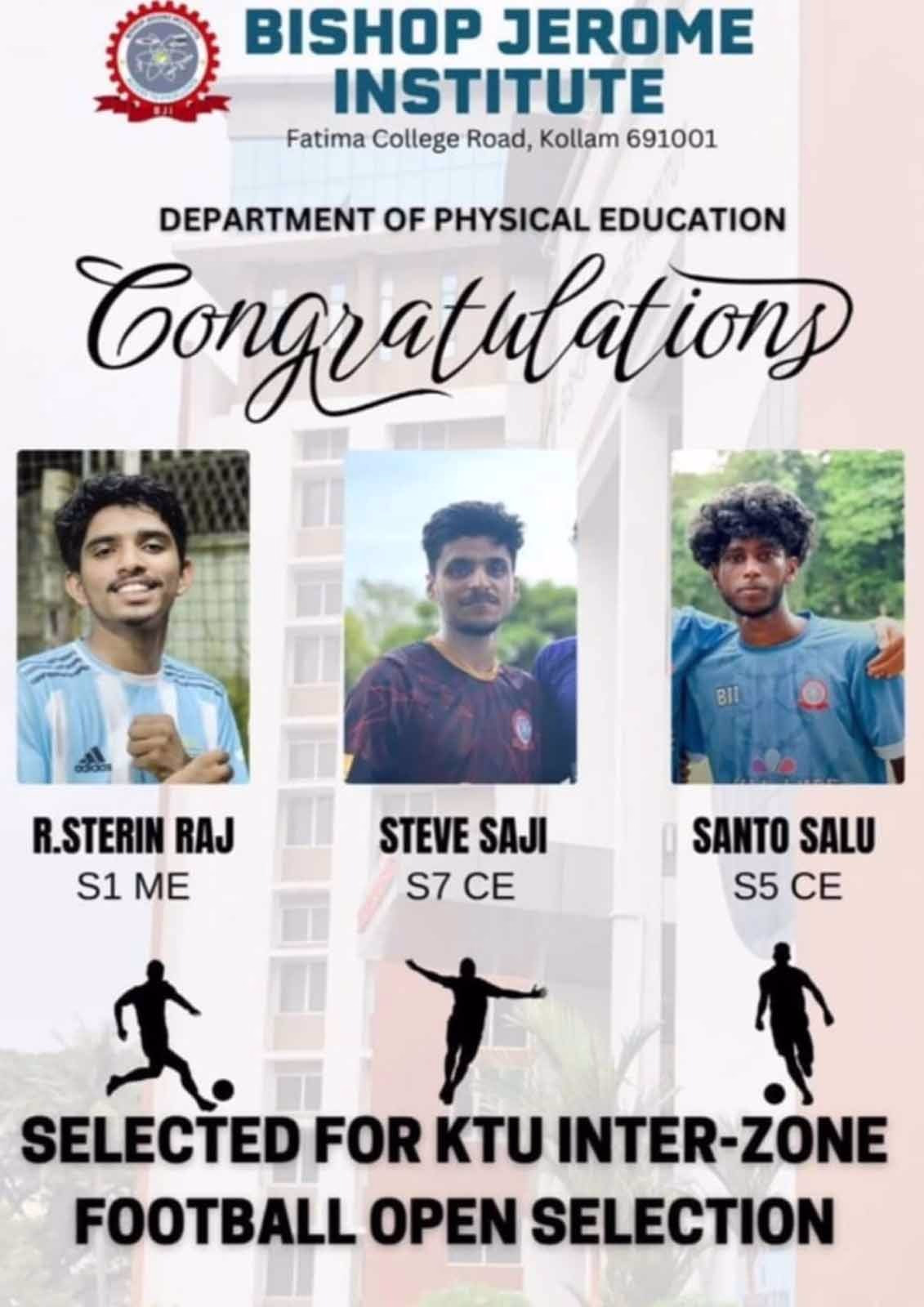The Physical Education Department of Bishop Jerome Institute conducted the KTU Interzone Football Open Selection. R Sterin Raj (S1 Mechanical), Steve Saji (S7 Civil), and Santo Salu (S5 Civil) were selected to represent the institute. Their achievement reflects the institute's commitment to nurturing athletic talent.