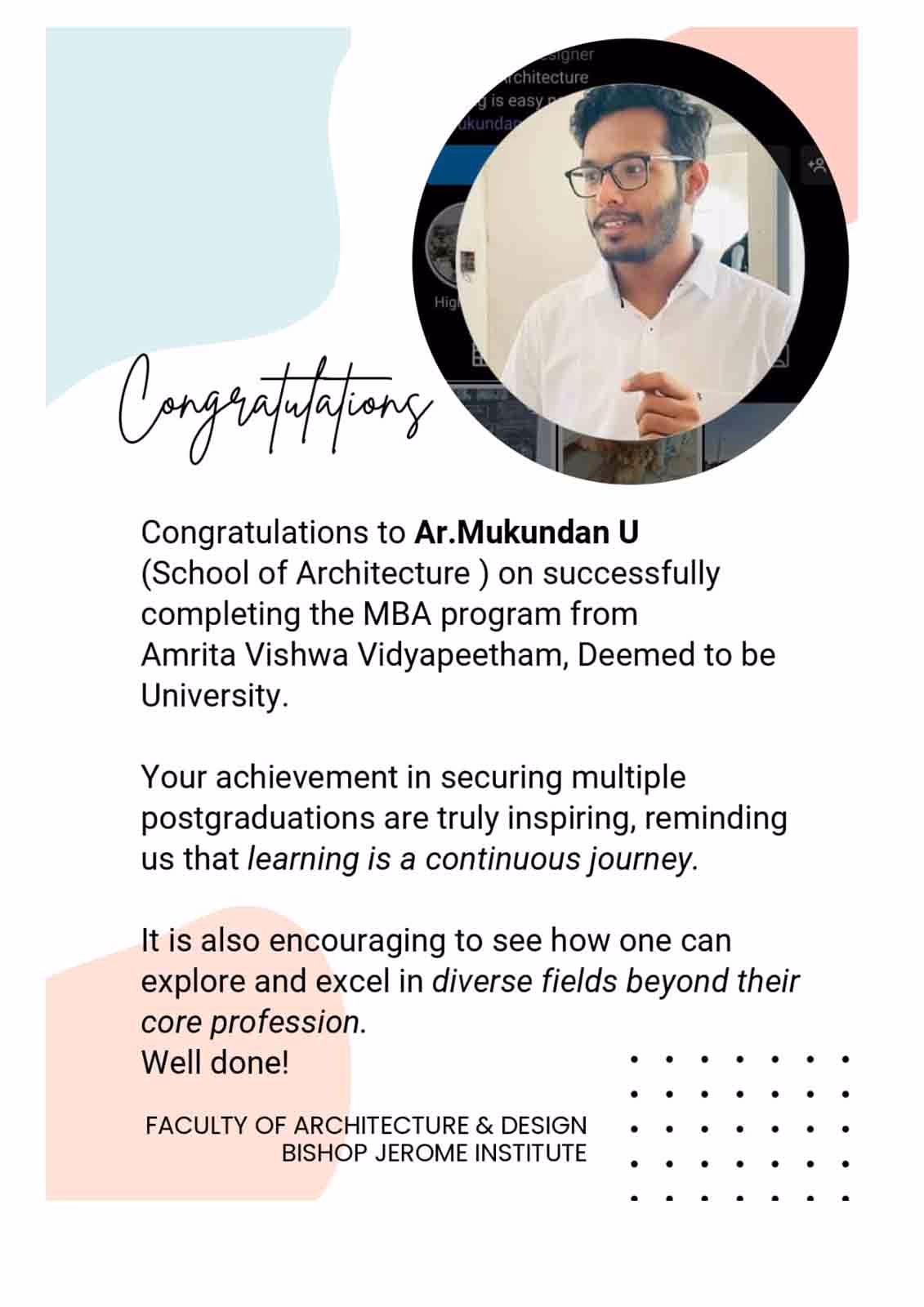 Congratulations to Ar.Mukundan U (School of Architecture) on successfully completing the MBA program from Amrita Vishwa Vidyapeetham, Deemed to be University.