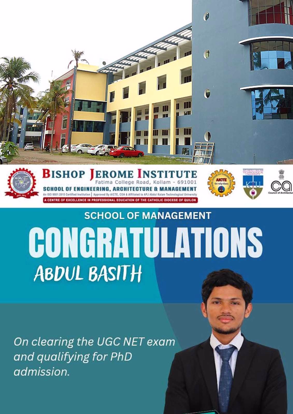The Bishop Jerome Institute (BJI) family is proud to announce a significant academic milestone achieved by one of our own. Abdul Basith, from the School of Management, has successfully cleared the prestigious UGC NET examination, qualifying him for PhD admission and Assistant Professorship.