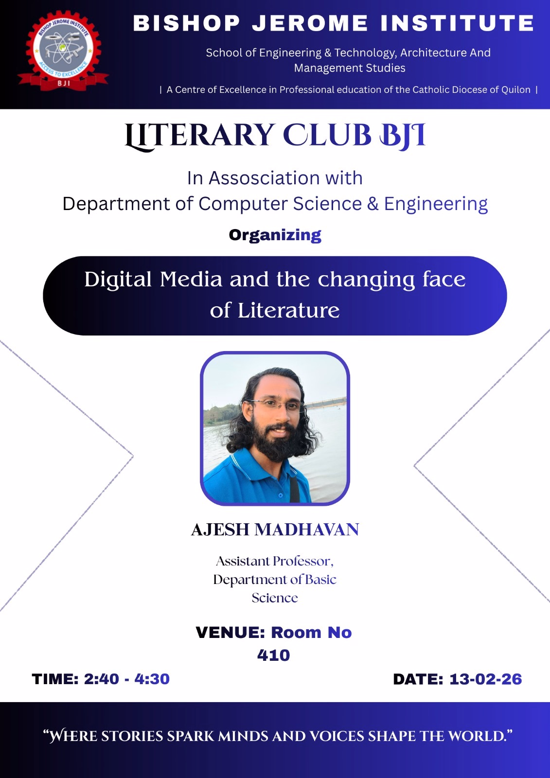 Kollam: The Literary Club of Bishop Jerome Institute (BJI), in collaboration with the Department of Computer Science & Engineering, is set to host an insightful seminar titled "Digital Media and the Changing Face of Literature." The event aims to explore how modern digital platforms and emerging technologies are reshaping the way we consume, create, and share stories in the 21st century.