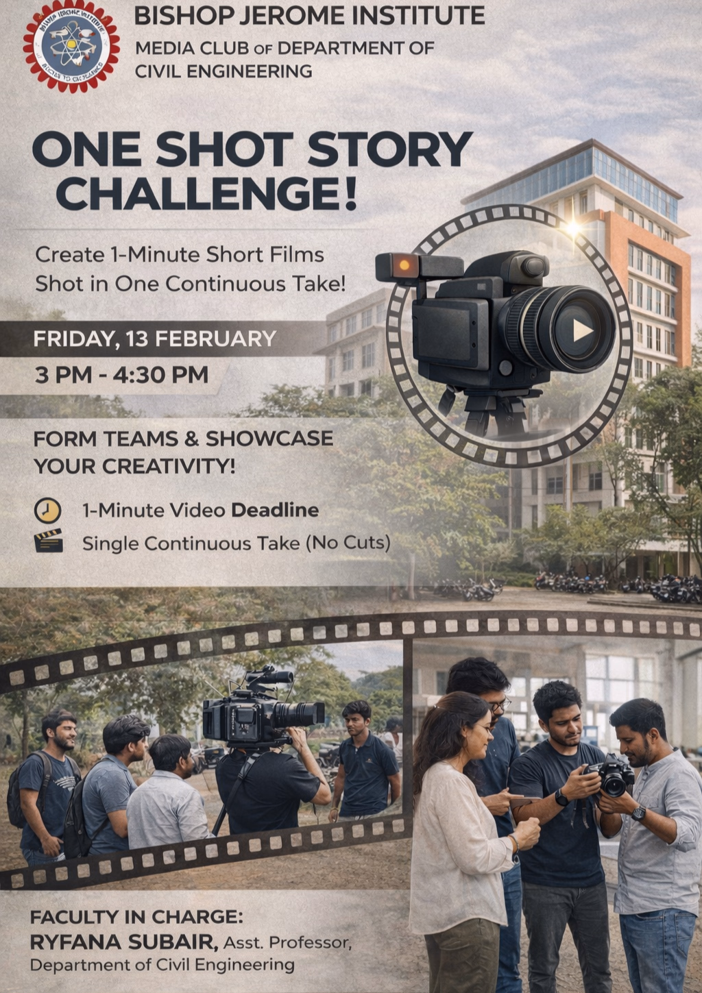 KOLLAM – The Media Club of the Department of Civil Engineering at Bishop Jerome Institute (BJI) is set to host a unique test of technical skill and creative storytelling: the One Shot Story Challenge.