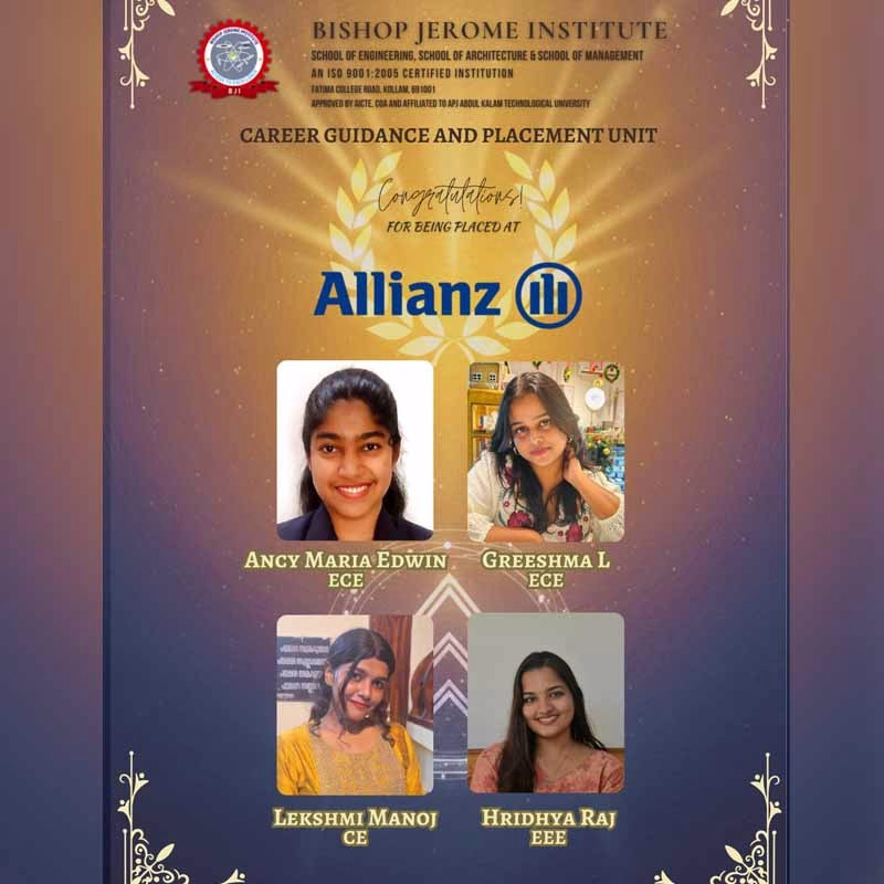 The Career Guidance and Placement Unit (CGPU) of Bishop Jerome Institute (BJI), Kollam, is delighted to announce that our students have been successfully placed at Allianz, a global leader in insurance and asset management.