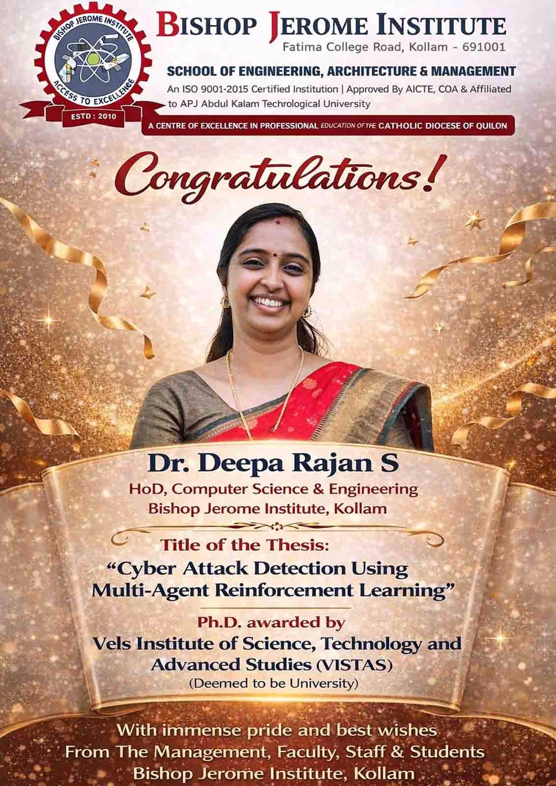 The Management, Principal, Faculty, and Students of Bishop Jerome Institute, Kollam, extend their warmest congratulations to Dr. Deepa Rajan S, Head of the Department (HoD), Computer Science & Engineering, on being awarded her Doctor of Philosophy (Ph.D.).