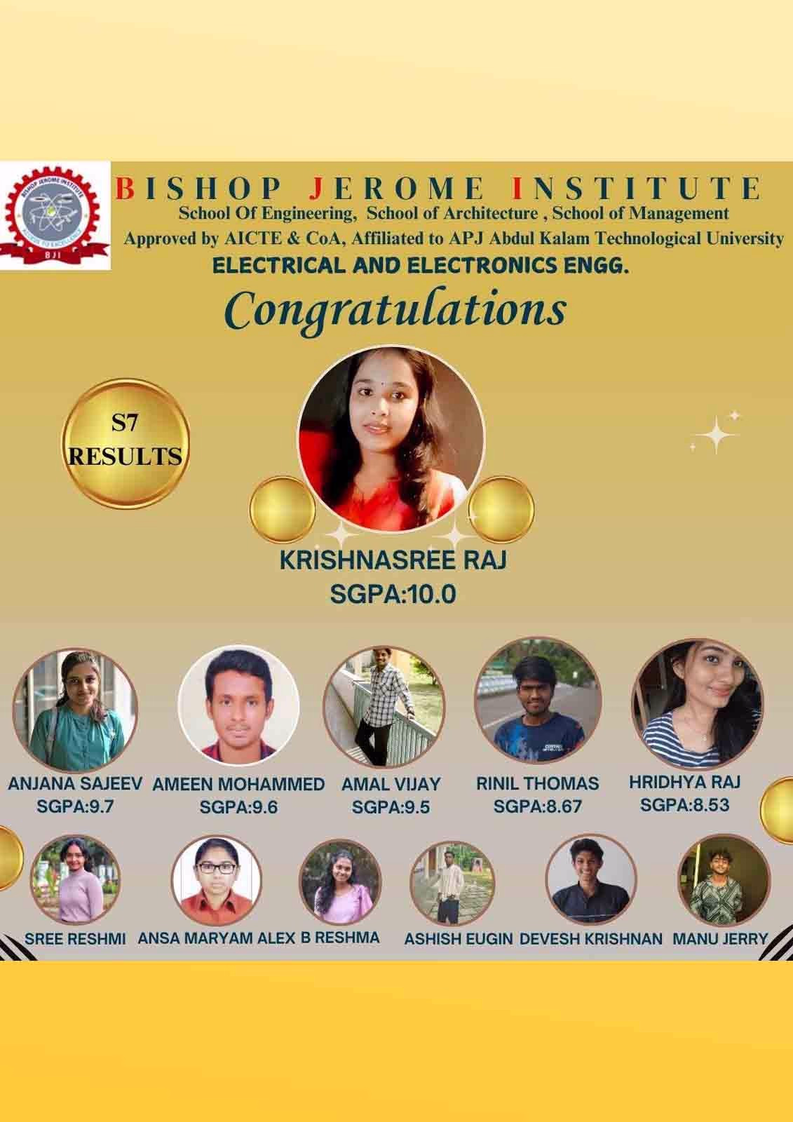 Bishop Jerome Institute (BJI) is proud to announce the exceptional performance of our Electrical and Electronics Engineering (EEE) students in their Semester 7 (S7) examinations. These results reflect the dedication of our students and the unwavering support of our faculty within the School of Engineering.