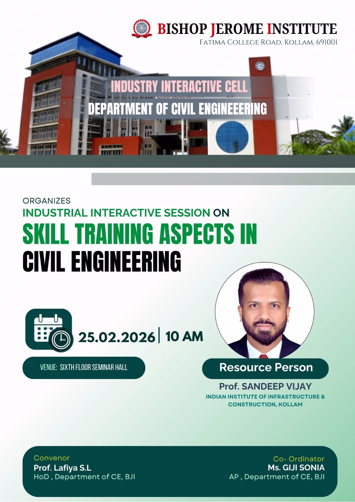 KOLLAM, February 25, 2026 – The Department of Civil Engineering at Bishop Jerome Institute (BJI), in collaboration with the Industry Interactive Cell, successfully organized a high-impact technical session titled "Skill Training Aspects in Civil Engineering" today at the Sixth Floor Seminar Hall.