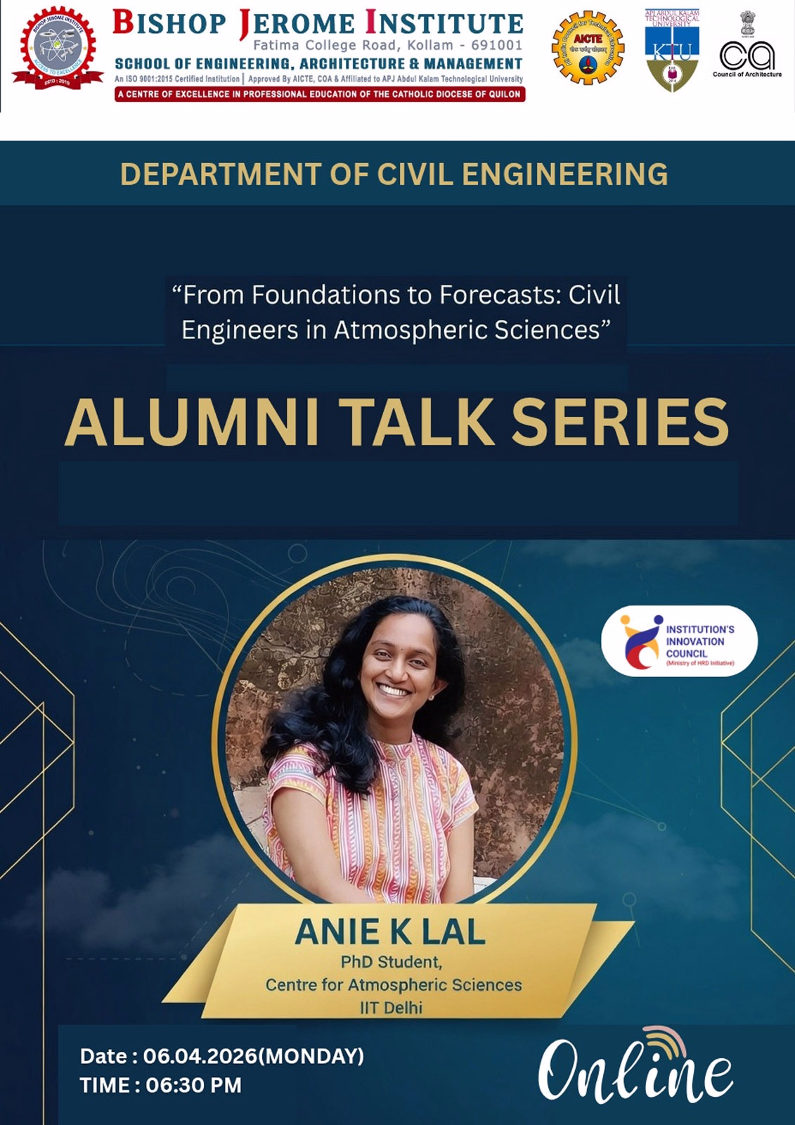 Bishop Jerome Institute, Kollam is proud to present an exciting installment of our Alumni Talk Series, hosted by the Department of Civil Engineering. We are honored to welcome one of our esteemed alumni, Anie K Lal, back to her alma mater—virtually.