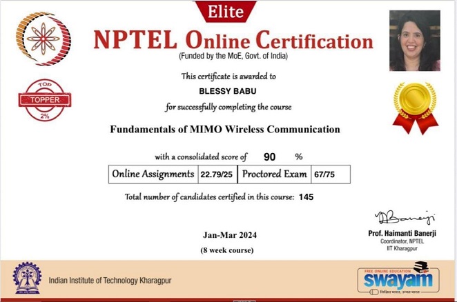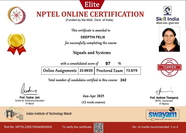 Signals and Systems, National Topper (Elite Gold medal) |