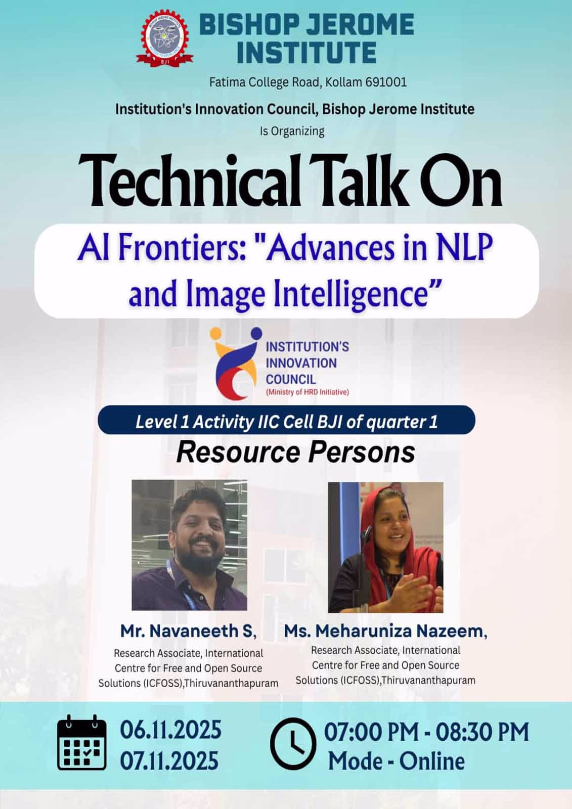 The Institution’s Innovation Council (IIC) of Bishop Jerome Institute, Kollam, is organizing a two-day online technical talk on “AI Frontiers: Advances in NLP and Image Intelligence” on 6th and 7th November 2025, from 7:00 PM to 8:30 PM. The session aims to provide participants with a comprehensive understanding of recent advancements in Artificial Intelligence, focusing on Natural Language Processing (NLP) and Image Intelligence. The sessions will be handled by experts from ICFOSS, Thiruvananthapuram, who will share valuable insights on cutting-edge research and practical applications in these domains. Level 1 Activity – IIC Cell BJI (Quarter 1).
